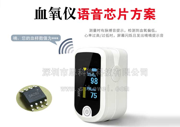 ![]() 智能血氧儀語音方案芯片,家用指甲式血氧儀語音IC推薦 智能血氧儀加入語音播放功能,可以在測量過程中對數(shù)值語音讀取,讓人們清楚地聽到測量結(jié)果,非常方便老人及視力不好的人群使用。 SK語音芯片,是深圳思科微科技有限公司新研發(fā)的一款OTP語音芯片、,較高音質(zhì)可以支持存放80秒語音內(nèi)容。是傳統(tǒng)OTP芯片,是可以寫入客戶想要內(nèi)部語音內(nèi)容,可以外接功放,聲音清晰洪亮,滿足不同場合的應(yīng)用需求;并且芯片內(nèi)置硬件SPI、UART、IIC、比較器等各類資源,外圍電路簡單,血氧儀喇叭小,SK語音芯片配合口徑小的喇叭可以播放出高音質(zhì)的語音,適用應(yīng)用在血氧儀語音方案。 智能血氧儀語音方案芯片: 1、開始測量; 2、您的血樣數(shù)值為***,脈率未見異常; 3、血氧飽和度***; 4、電量不足,請及時更換新電池;