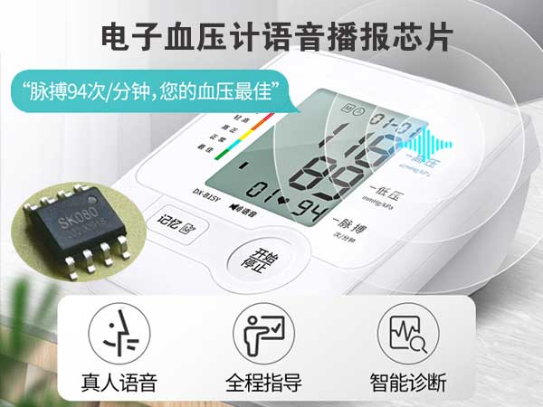 ![]() 電子血壓計語音播報芯片 價格:1.8 型號:SK080G 包裝:SOP8 品牌:思科微 電子血壓計語音播報芯片,老人臂式測量儀語音播報芯片,高精準、全自動、醫(yī)生用、歐盟CE認證 一鍵準確測壓 全程語音播報,語音播報全程指導,真人語音,全程播報,看得見更聽得清。 *“高壓120mmHg,低壓89mmHg” *“脈搏94次/分鐘,您的血壓最佳” 思科微語音芯片,語音單片機,聲音播放芯片,錄音模塊,專業(yè)廠家,滿足客戶需求,高穩(wěn)定性,種類多,電子接口,滿足您的需求,免費咨詢,免費送樣