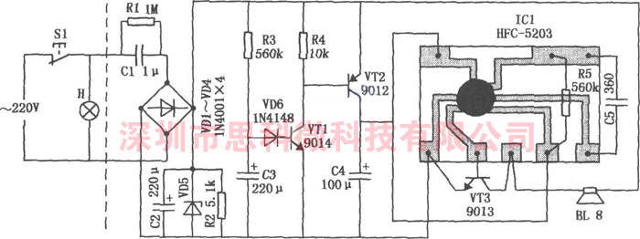 本電路能在電冰箱門打開若干秒鐘以后自動連續(xù)地發(fā)出“請關(guān)門”的提示語音,提醒主人及時關(guān)上冰箱門。電路如圖所示。虛線左邊為電冰箱照明燈控制電路,其中S1為冰箱照明燈門控開關(guān);右半部分為冰箱關(guān)門提示電路。當(dāng)冰箱門打開時,Sl自動閉合,照明燈H點亮,H兩端的交流電源經(jīng)Cl、VDl~VD5及C2組成的降壓、整流、穩(wěn)壓電路,輸出約3.9V直流電為提示電路供電。此直流電源經(jīng)R3向C3充電。由于電容兩端的電壓不能突變,故剛開門時C3的正極端仍為低電平,VD6、VTl均截止,VT2因此也截止,ICl語言集成電路HFC5203不工作,揚聲器BL不發(fā)聲。當(dāng)C3兩端電壓充到l.3V左右時,VD6和VTl由截止轉(zhuǎn)入導(dǎo)通,三極管VT2也隨之導(dǎo)通,ICl通電工作,BL就發(fā)出“請關(guān)門”的語音聲。R5、C5數(shù)值決定語音音調(diào)的高低,采用圖示參數(shù)為悅耳動聽的女聲“請關(guān)門”。如將C5加大到560pF就變成了男聲“請關(guān)門”。
