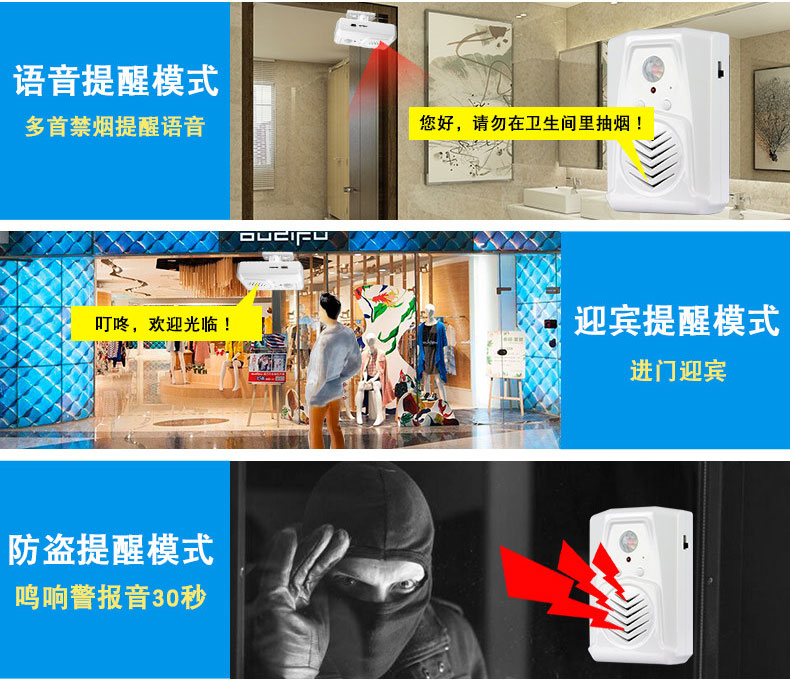 禁煙語(yǔ)音提醒器,禁煙宣傳好幫手,它可以安裝在車(chē)站、樓梯、廁所等多種場(chǎng)所,通過(guò)紅外線感應(yīng)到人就可以自動(dòng)提示。本產(chǎn)品由深圳思科微電子有限公司研發(fā)生產(chǎn),其功能簡(jiǎn)單強(qiáng)大,音質(zhì)優(yōu)美。它采用人體感應(yīng)原理。有多種款式選擇;單位控?zé)熣Z(yǔ)音提醒、物業(yè)管理控?zé)熖嵝�、禁煙語(yǔ)音提醒、醫(yī)院場(chǎng)所禁煙提示。 |