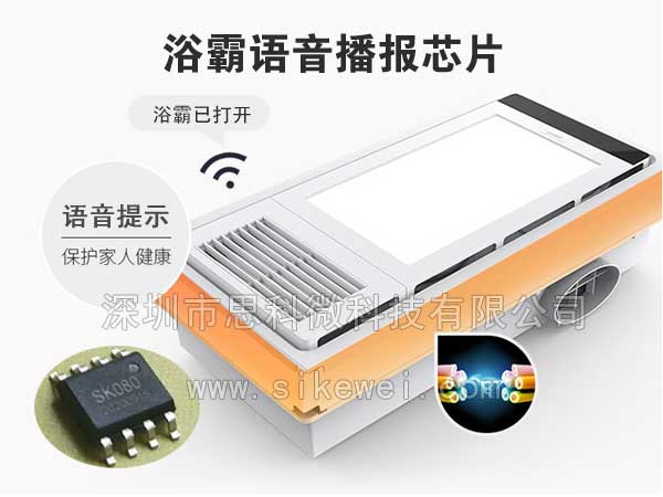 浴霸語音播報(bào)芯片,浴霸語音方案應(yīng)用,廣泛滿足客戶的不同應(yīng)用需要,真人語音播報(bào)操作簡單方便,語音支持國語、英語、日語、粵語、中英雙語等多種語言。我司SK系列語音芯片可廣泛應(yīng)用于廚房家電、燈具、個(gè)人護(hù)理小家電、衛(wèi)浴、電梯、語音玩具等方面。 浴霸語音播報(bào)芯片 ...... 思科微專業(yè)語音ic廠家,集研發(fā)生產(chǎn)一體,質(zhì)量好,高穩(wěn)定性,音質(zhì)佳,提供免費(fèi)技術(shù)支持.21年沉淀,已服務(wù)于超過5000家企業(yè),各大知名企業(yè)指定語音IC/音樂IC/報(bào)警芯片一級供應(yīng)商,