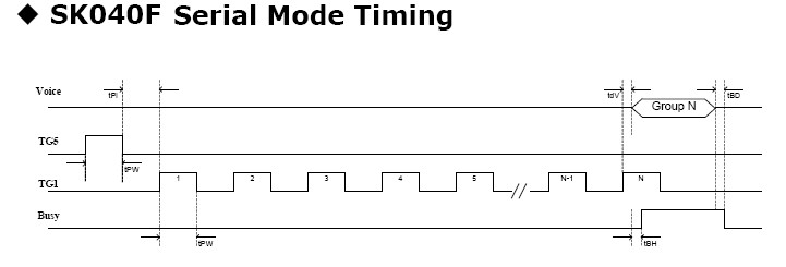 TG5(復位)先給一個高脈沖復位,高電平時間保持至少100uS,再等待100uS后,TG1開始發(fā)出高脈沖,高電平保持的時間不得少于50uS,典型值為100uS。脈沖數(shù)一結束,聲音馬上輸出,BUSY輸出高電平。