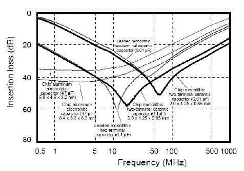 Z=ESR+jωL-1/jωC= ESR+j2πf L-1/j2πf C�?梢姰�(dāng)頻率很低的時(shí)候是電容起作用,而頻率高到一定的時(shí)候電感的作用就不可忽視了,再高的時(shí)候電感就起主導(dǎo)作用了。電容就失去濾波的作用了。所以記住,高頻的時(shí)候電容就不是單純的電容了。實(shí)際電容的濾波曲線如下圖所示。
